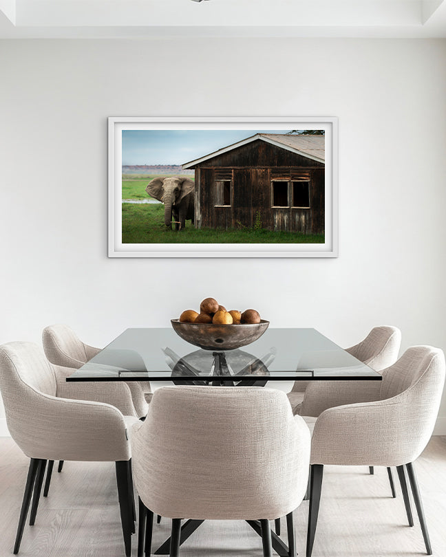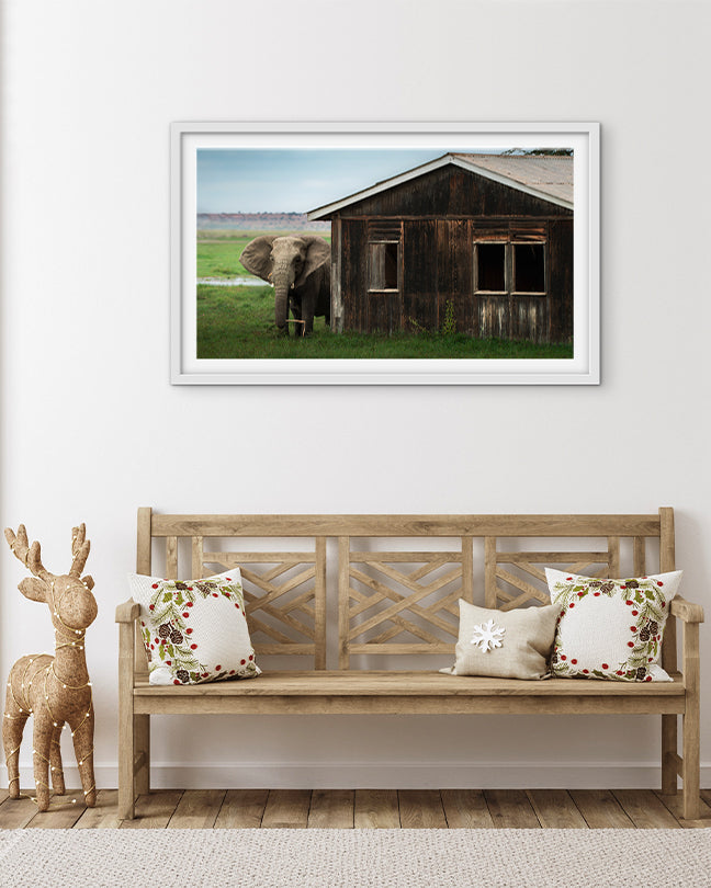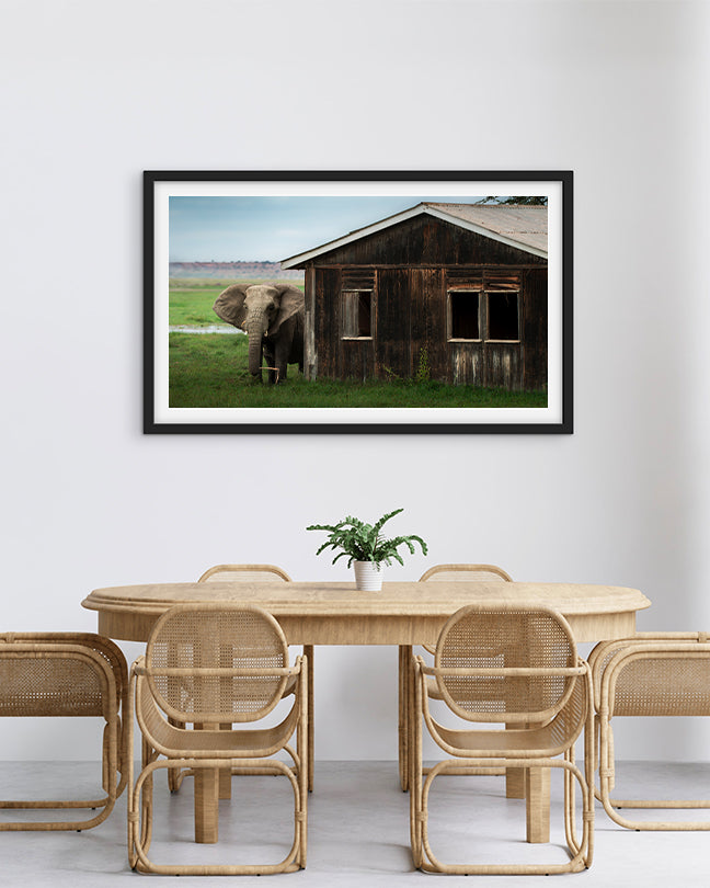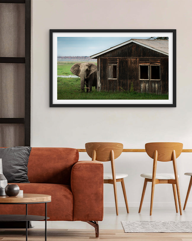 Add a touch of raw wilderness to your home with this eco-conscious canvas wall art featuring a majestic elephant beside a weathered wooden hut. This high-resolution wildlife photograph is perfect for rustic and sustainable interiors, inspiring connection with nature while complementing earthy, minimalist, or boho design themes. Crafted using environmentally friendly materials, this piece reflects your love for wildlife and commitment to sustainable interior decor.