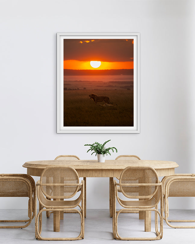 Let the majesty of the savannah illuminate your space with “Sunset Sovereignty”, a handcrafted photo frame from Wild Frames. This breathtaking image captures a lion couple silhouetted against a glowing sunset — a powerful tribute to the raw beauty of nature.
