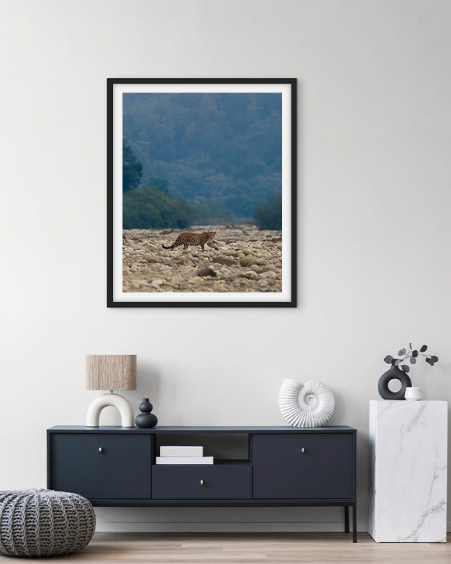 Solitude captures a lone leopard crossing a rocky riverbed raw, wild, and striking. Perfect for eco-friendly interior decor in homes, hotels, restaurants, and office spaces. Printed on